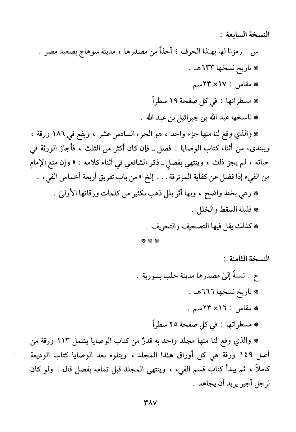 * والذي وقع لنا منها مجلد واحد به قدرٌ من كتاب الوصايا يشمل 113 ورقة من أصل 149 ورقة هي كل أوراق هذا المجلد، ويتلوه بعد الوصايا كتاب الوديعة كاملاً، ثم يبدأ كتاب قسم الفيء، وينتهي المجلد قبل تمامه بفصل قال: ولو كان لرجل أجير يريد أن يجاهد.