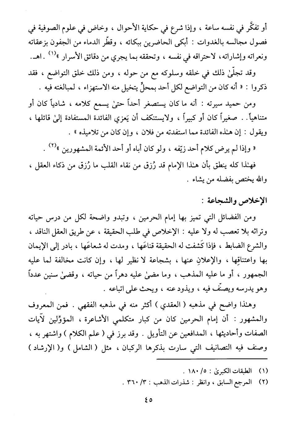 ومن الفضائل التي تميز بها إمام الحرمين، وتبدو واضحة لكل من درس حياته وتراثه بلا تعصب له ولا عليه: الإخلاص في طلب الحقيقة، عن طريق العقل الناقد، والشرع الضابط، فإذا كَشفت له الحقيقة قناعَها، ومدت له شعاعَها، بادر إلى الإيمان بها واعتناقِها، والإعلانِ عنها، بشجاعة لا نظير لها، وإن كانت مخالفة لما عليه الجمهور، أو ما عليه المذهب، وما مضى عليه دهراً من حياته، وقضى سنين عدداً وهو يدرسه ويصنّف فيه، ويذود عنه، ويحث على اتباعه.