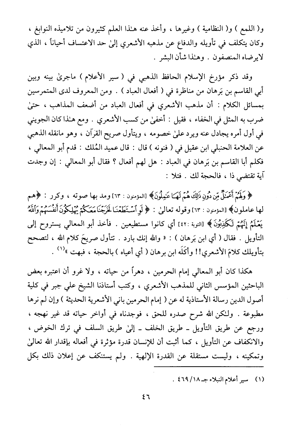 هكذا كان أبو المعالي إمام الحرمين، دهراً من حياته، ولا غرو أن اعتبره بعض الباحثين المؤسس الثاني للمذهب الأشعري، وكتب أستاذنا الشيخ علي جبر في كلية أصول الدين رسالة الأستاذية له عن (إمام الحرمين باني الأشعرية الحديثة) وإن لم نرها مطبوعة. ولكن الله شرح صدره للحق، فوجدناه في أواخر حياته قد غير نهجه، ورجع عن طريق التأويل -طريق الخلف- إلى طريق السلف في ترك الخوض، والانكفاف عن التأويل، كما أثبت أن للإنسان قدرة مؤثرة في أفعاله بإقدار الله تعالى وتمكينه، وليست مستقلة عن القدرة الإلهية. ولم يستنكف عن إعلان ذلك بكل