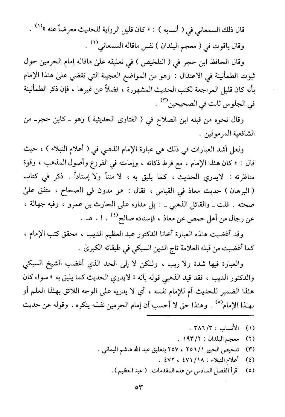 والعبارة فيها شدة ولا ريب، ولكن لا إلى الحد الذي أغضب الشيخ السبكي والدكتور الديب، فقد قيد الذهبي قوله بأنه " لا يدري الحديث كما يليق به " سواء كان هذا الضمير للحديث أم للإمام نفسه، أي لا يدريه على الوجه اللائق بهذا العلم أو بهذا الإمام (¬5). وهذا حق لا أحسب أن إمام الحرمين نفسَه ينكره. وقوله عن حديث