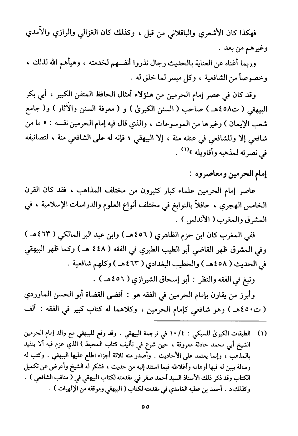 (¬1) الطبقات الكبرى للسبكي: 4/ 10 في ترجمة البيهقي. وقد وقع للبيهقي مع والد إمام الحرمين الشيخ أبي محمد حادثة معروفة، حين شرع فىِ تاليف كتاب المحيط) الذي عزم فيه ألا يتقيد بالمذهب، وإنما يعتمد على الأحاديث. وأصدر منه ثلاثة أجزاء اطلع عليها البيهقي. وكتب له رسالة يبين له فيها أوهامه وأغلاطه فيما استند إليه من حديث، فشكر له الشيخ وأعرض عن تكميل الكتاب وقد ذكر ذلك الأستاذ السيد أحمد صقر في مقدمته لكتاب البيهقي في (مناقب الشافعي).