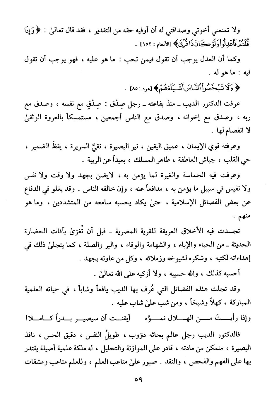 ولا تمنعني أخوتي وصداقتي له أن أوفيه حقه من التقدير، فقد قال تعالى: (وَإِذَا قُلْتُمْ فَاعْدِلُوا وَلَوْ كَانَ ذَا قُرْبَى) [الأنعام: 152].