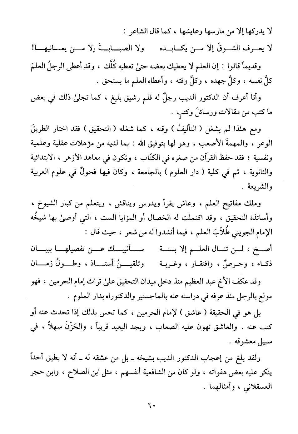 وقد عكف الأخ عبد العظيم منذ دخل ميدان التحقيق على تراث إمام الحرمين، فهو مولع بالرجل منذ عرفه في دراسته عنه بالماجستير والدكتوراه بدار العلوم.