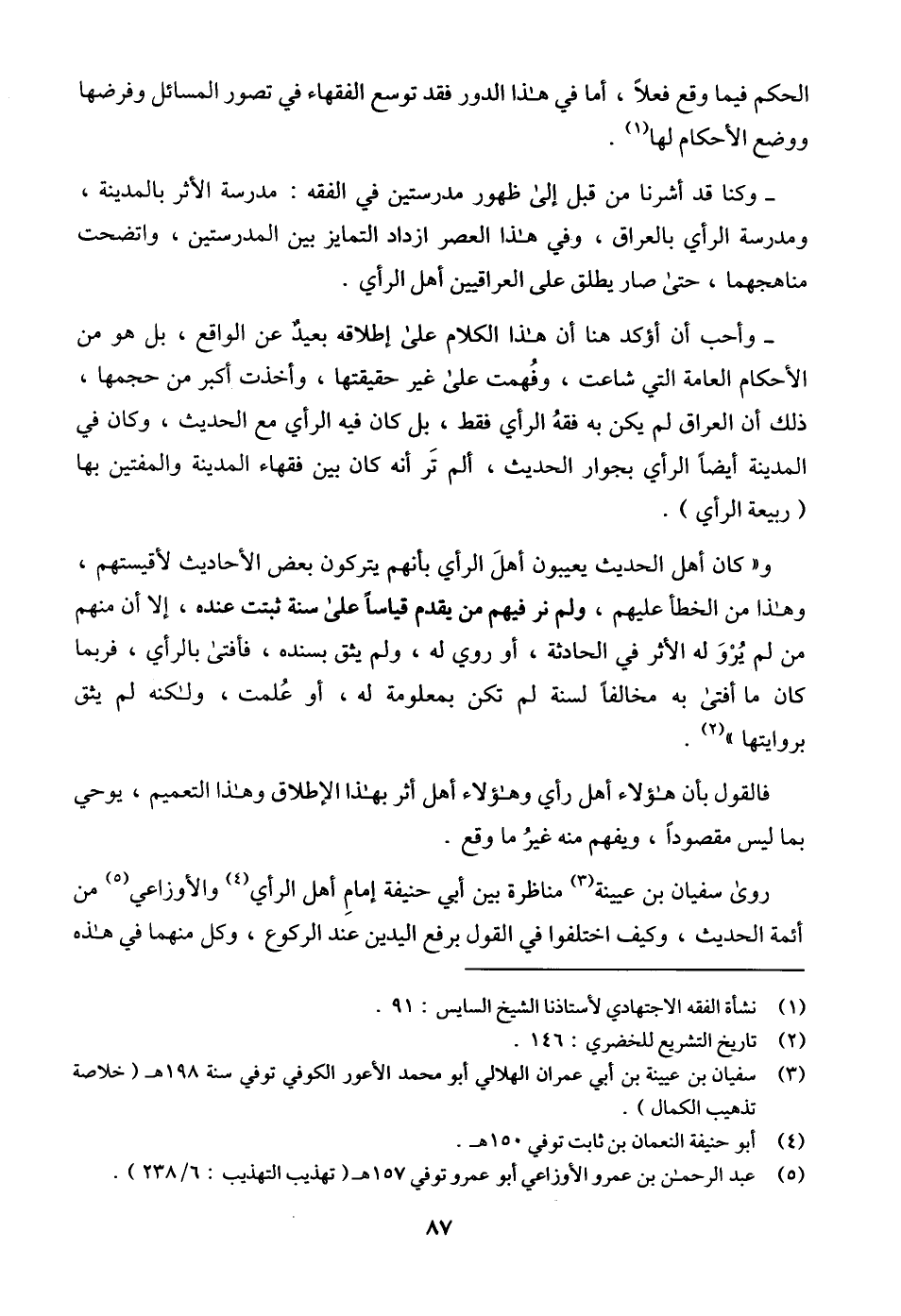 - وأحب أن أؤكد هنا أن هذا الكلام على إطلاقه بعيدٌ عن الواقع، بل هو من الأحكام العامة التي شاعت، وفُهمت على غير حقيقتها، وأخذت أكبر من حجمها، ذلك أن العراق لم يكن به فقهُ الرأي فقط، بل كان فيه الرأي مع الحديث، وكان في المدينة أيضاً الرأي بجوار الحديث، ألم تَر أنه كان بين فقهاء المدينة والمفتين بها (ربيعة الرأي).