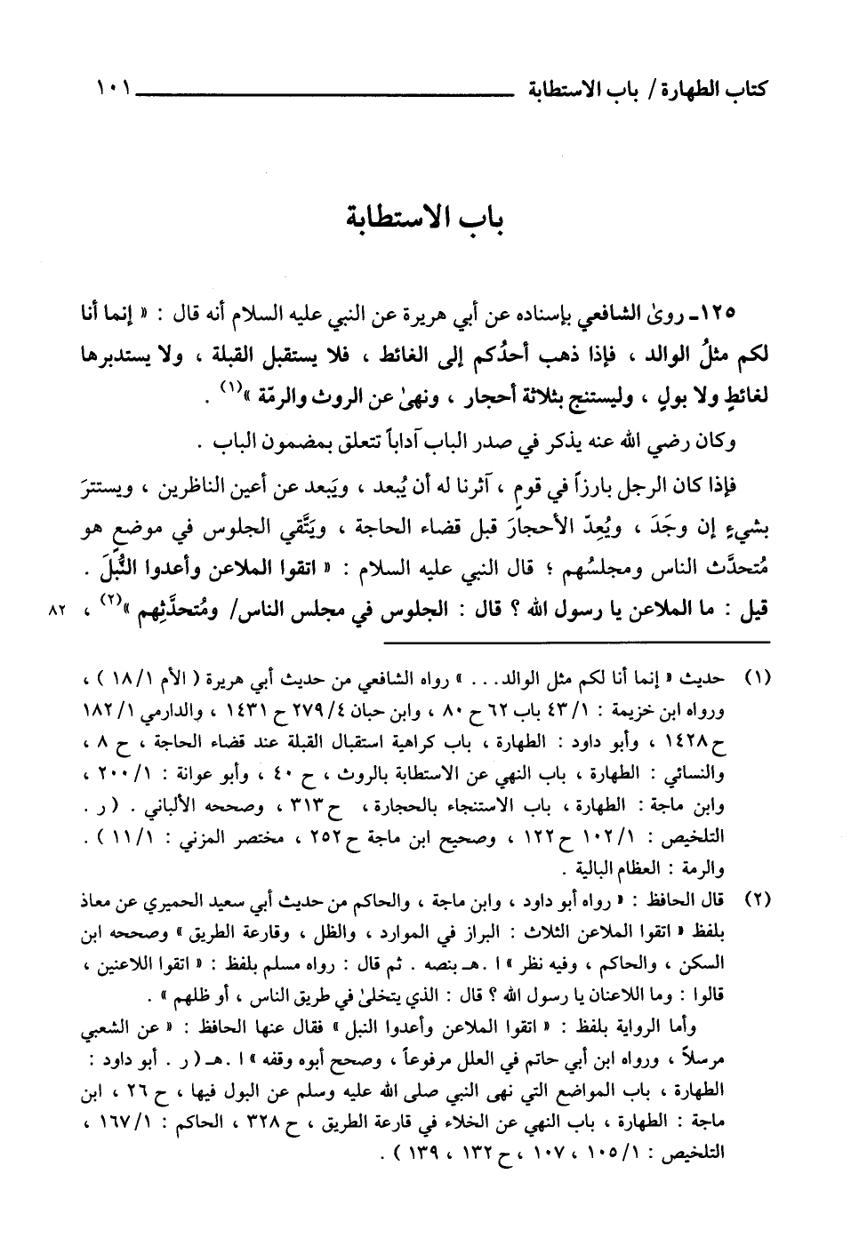 125 - روى الشافعي بإسناده عن أبي هريرة عن النبي عليه السلام أنه قال: " إنما أنا لكم مثلُ الوالد، فإذا ذهب أحدُكم إلى الغائط، فلا يستقبل القبلة، ولا يستدبرها لغائطٍ ولا بولٍ، وليستنج بثلاثة أحجار، ونهى عن الروث والرمّة " (¬1).