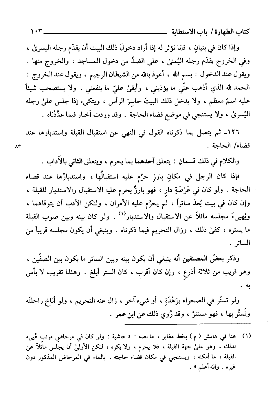 126 - ثم يتصل بما ذكرناه القول في النهي عن استقبال القبلة واستدبارها عند قضاء الحاجة.
