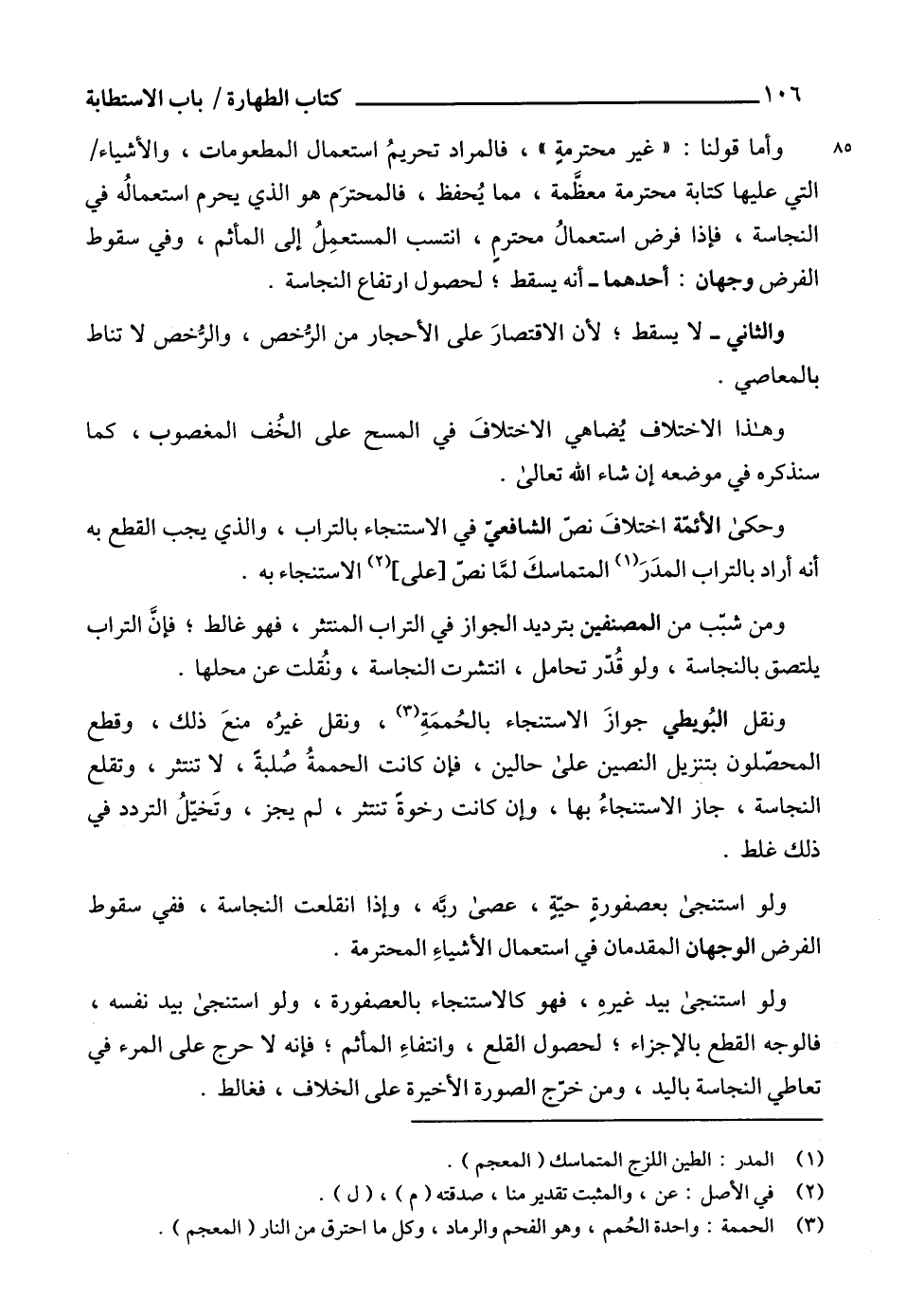 ونقل البُويطي جوازَ الاستنجاء بالحُممَةِ (¬3)، ونقل غيرُه منعَ ذلك، وقطع المحصّلون بتنزيل النصين على حالين، فإن كانت الحممةُ صُلبةً، لا تنتثر، وتقلع النجاسة، جاز الاستنجاءُ بها، وإن كانت رخوةً تنتثر، لم يجز، وتَخيّلُ التردد في ذلك غلط.