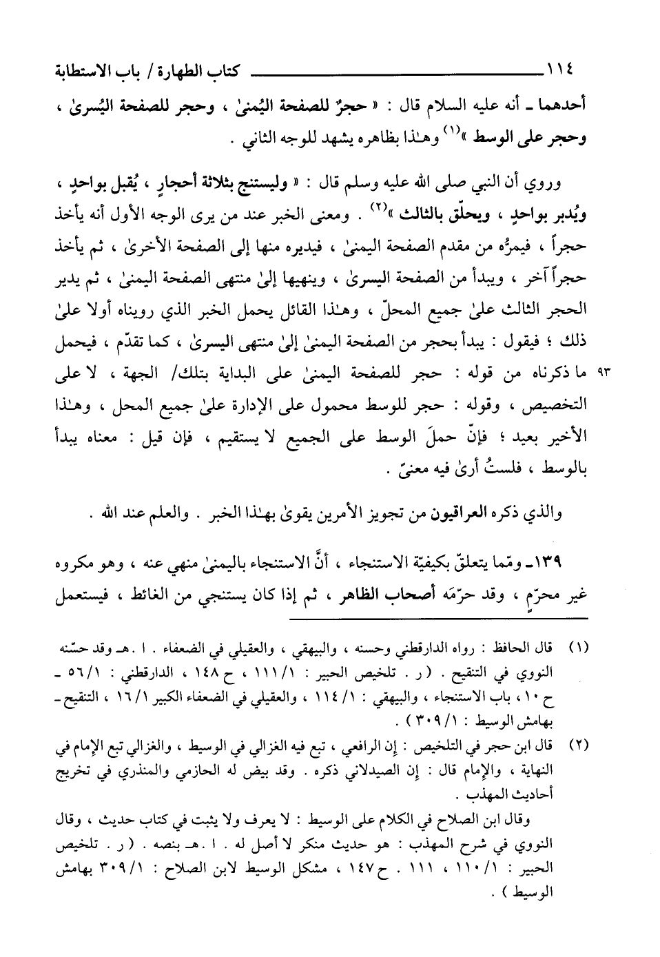 139 - ومّما يتعلقّ بكيفيّة الاستنجاء، أنَّ الاستنجاء باليمنى منهي عنه، وهو مكروه غير محرّمٍ، وقد حرّمَه أصحاب الظاهر، ثم إذا كان يستنجي من الغائط، فيستعمل