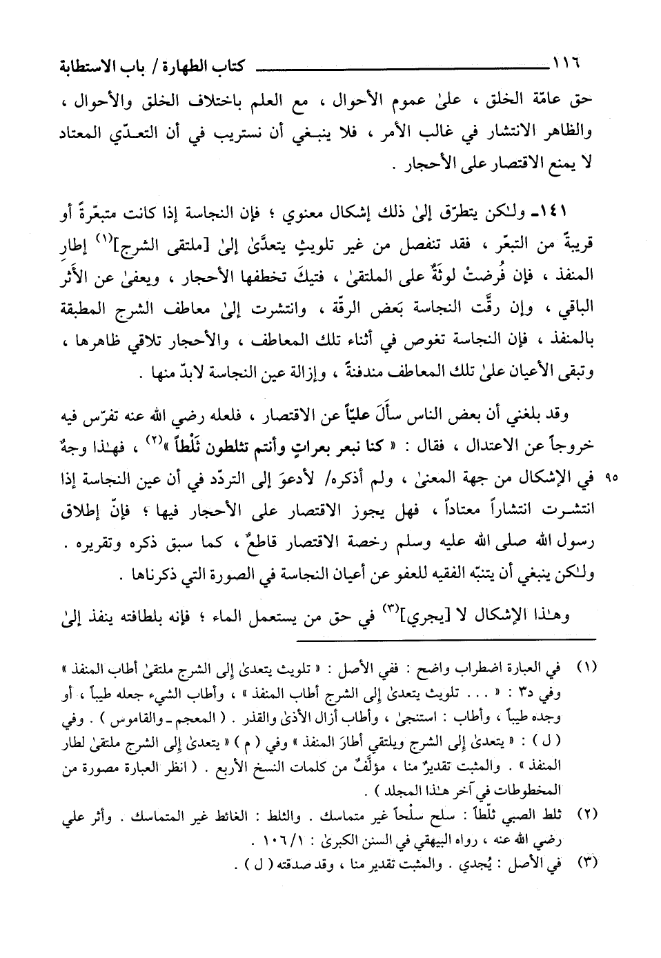 141 - ولكن يتطرّق إلى ذلك إشكال معنوي، فإن النجاسة إذا كانت متبعّرة أو قريبةً من التبعّر، فقد تنفصل من غير تلويثٍ يتعدَّى إلى [ملتقى الشرج] (¬1) إطارِ المنفذ، فإن فُرضتْ لوثَةٌ على الملتقى، فتيكَ تخطفها الأحجار، ويعفى عن الأَثر الباقي، وإن رقَّت النجاسة بَعض الرقّة، وانتشرت إلى معاطف الشرج المطبقة بالمنفذ، فإن النجاسة تغوص في أثناء تلك المعاطف، والأحجار تلاقي ظاهرها، وتبقى الأعيان على تلك المعاطف مندفنةً، وإزالة عين النجاسة لا بدّ منها.