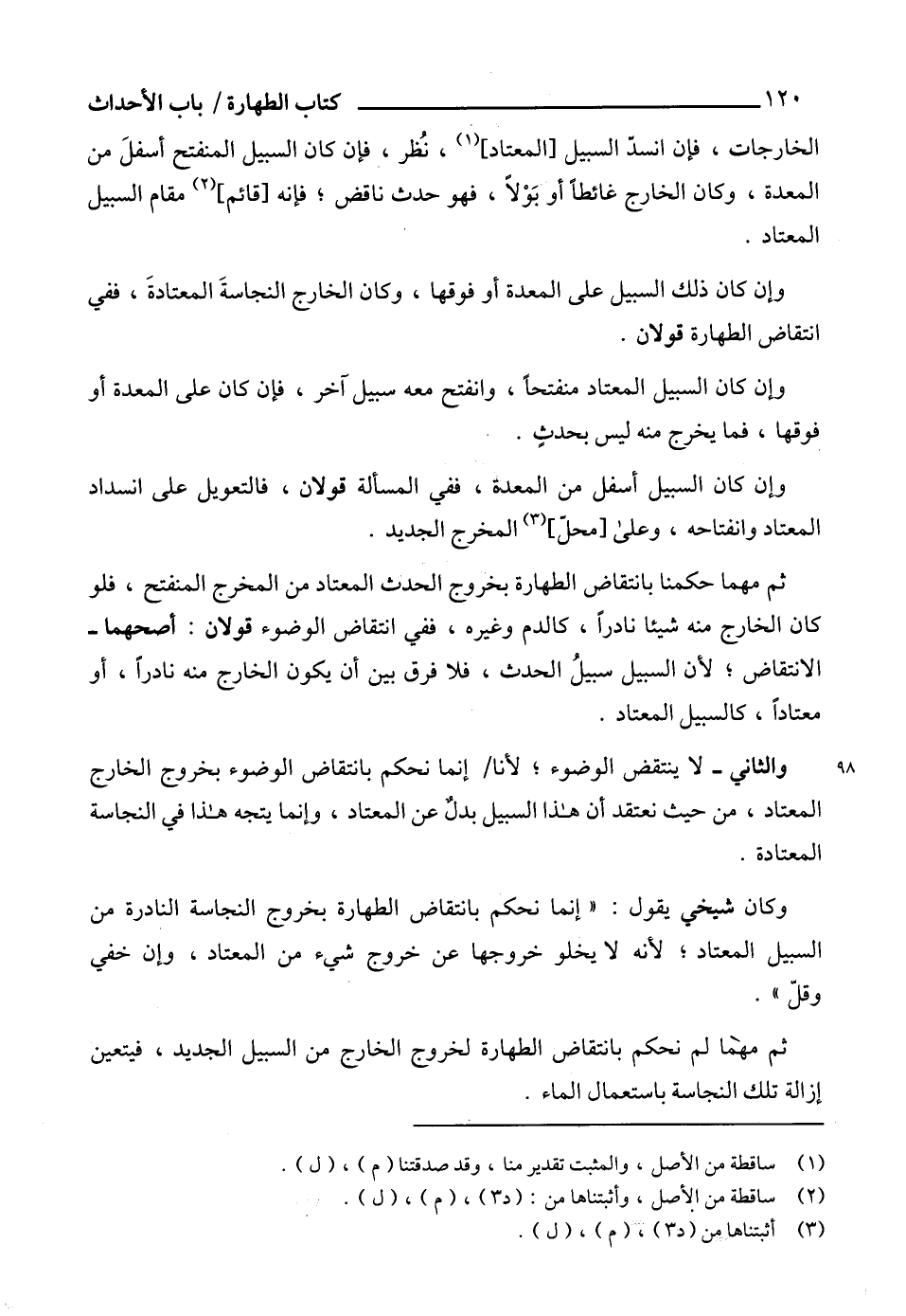 وإن كان ذلك السبيل على المعدة أو فوقها، وكان الخارج النجاسةَ المعتادةَ، ففي انتقاض الطهارة قولان.