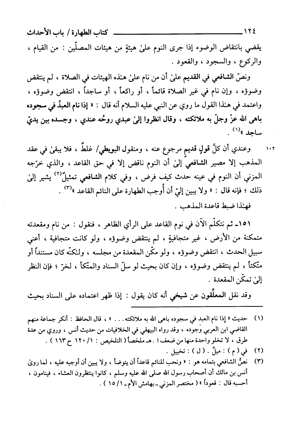 (¬3) نصُّ الشافعي بتمامه هو: " ونحب للنائم قاعداً أن يتوضأ، ولا يبين أن أوجبه عليه، لما روى أنس بن مالك أن أصحاب رسول الله صلى الله عليه وسلم، كانوا ينتظرون العشاء، فينامون، أحسبه قال: قعوداً " (مختصر المزني - بهامش الأم - 1/ 15).