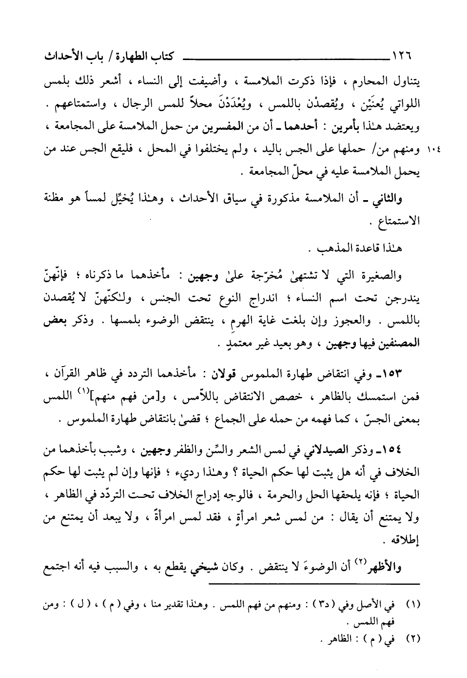 153 - وفي انتقاض طهارة الملموس قولان: مأخذهما التردد في ظاهر القرآن، فمن استمسك بالظاهر، خصص الانتقاض باللاّمس، و [من فهم منهم] (¬1) اللمس بمعنى الجسّ، كما فهمه من حمله على الجماع؛ قضى بانتقاض طهارة الملموس.