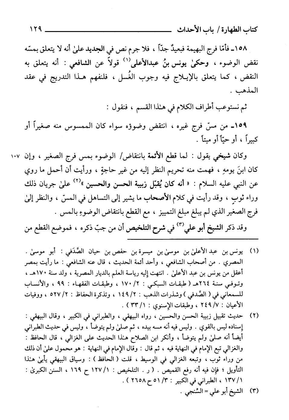 (¬2) حديث تقبيل زبيبة الحسن والحسين، رواه البيهقي، والطبراني في الكبير، وقال البيهقي: إِسناده ليس بالقوي. وليس فيه أنه مسه بيده، ثم صلى ولم يتوضأ، وليس في حديث الطبراني أيضاً أنه صلى ولم يتوضأ، وأنكر ابن الصلاح هذا الحديث على الغزالي، قال الحافظ: والغزالي تبع الإِمام في النهاية فيه، ثم قال: وقال الإِمام في النهاية: هو محمول على أن ذلك من وراء ثوب، وتبعه الغزالي في الوسيط، قلت (الحافظ): وسياق البيهقي يأبى هذا التأويل؛ فإن فيه أنه رفع القميص. (ر. التلخيص: 1/ 127 ح 169، السنن الكبرى: 1/ 137، الطبراني في الكبير: 3/ 51 ح 2658).