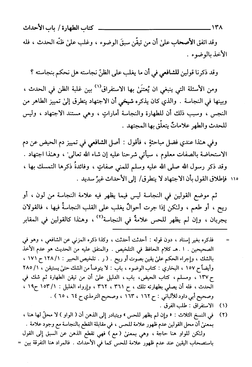 = فذكره بغير إِسناد، دون قوله: أحدثت أحدثت، وكذا ذكره المزني عن الشافعي، وهو في الصحيحين. ا. هـ كلام الحافظ في التلخيص. والمتفق عليه من الحديث هو عدم الأخذ بالشك، وإِجراء الحكم على يقين بصوت أو ريح. (ر. تلخيص الحبير: 1/ 128 ح 171، وأيضاً ح 157، البخاري: كتاب الوضوء، باب: لا يتوضأ من الشك حتى يستيقن، 1/ 285 ح 137، ومسلم، كتاب الحيض، باب، الدليل على أن من تيقن الطهارة ثم شك في الحدث، فله أن يصلي بطهارته تلك، ح 361، 362، وإِرواء الغليل: 1/ 153 ح 19، وصحيح أبي داود للألباني: ح 162، 163، وصحيح الترمذي ح 64، 65).