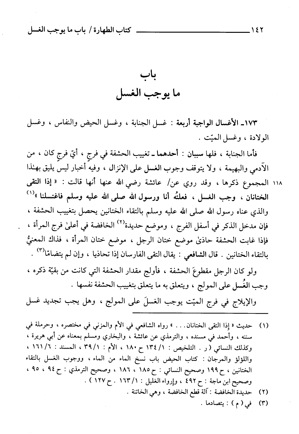 (¬1) حديث " إِذا التقى الختانان ... " رواه الشافعي في الأم والمزني في مختصره، وحرملة في سننه، وأحمد في مسنده، والترمذي عن عائشة، والبخاري ومسلم بمعناه عن أبي هريرة، وكذلك النسائي (ر. التلخيص: 1/ 134 ح 180، الأم: 1/ 39، المسند: 6/ 161، واللؤلؤ والمرجان: كتاب الحيض باب نسخ الماء من الماء، ووجوب الغسل بالتقاء الختانين، ح 199 وصحيح النسائي: ح 185، 186، وصحيح الترمذي: ح 94، 95، وصحيح ابن ماجة: ح 492، اِرواء الغليل: 1/ 163 ح 127).