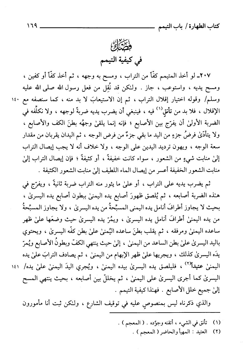 ثم يضرب يديه على التراب، أو على ما يثور منه التراب ضربة ثانيةً، ويفرّج في هذه الضربة أصابعه، ثم يُلصق ظهورَ أصابع يده اليمنى ببطون أصابع يده اليسرى، بحيث لا يجاوز أطرافَ أنامل يده اليمنى المسبِّحةُ من يده اليسرى، ولا يجاوز المسبِّحةُ من يده اليمنى أطرافَ أنامل يده اليسرى، ويمُرّ يده اليسرى حيث وضعَها على ظهر ساعده اليمنى ومرفقه، ثم يقلب بطنَ ساعده اليُمنى على بطن كفّه اليسرى، ويحتوي باليد اليسرى على بطن الساعد من اليمنى، إلى حيث ينتهي الكفّ وبطونُ الأصابع وُيمرّ يدَه اليسرى كذلك، ويجريها على ظهر الإبهام من اليمنى، ثم يصادف الترابَ على يده اليمنى عتيداً (¬2)، فليلصق يده اليسرى بيده اليمنى، ويُجري اليدَ اليمنى على يده اليسرى كما أجرى اليسرى على اليمنى، ثم يخلّل بين أصابعه، بحيث ينتهي المسح إلى جميع خلل الأصابع. فهذا كيفية التيمم.