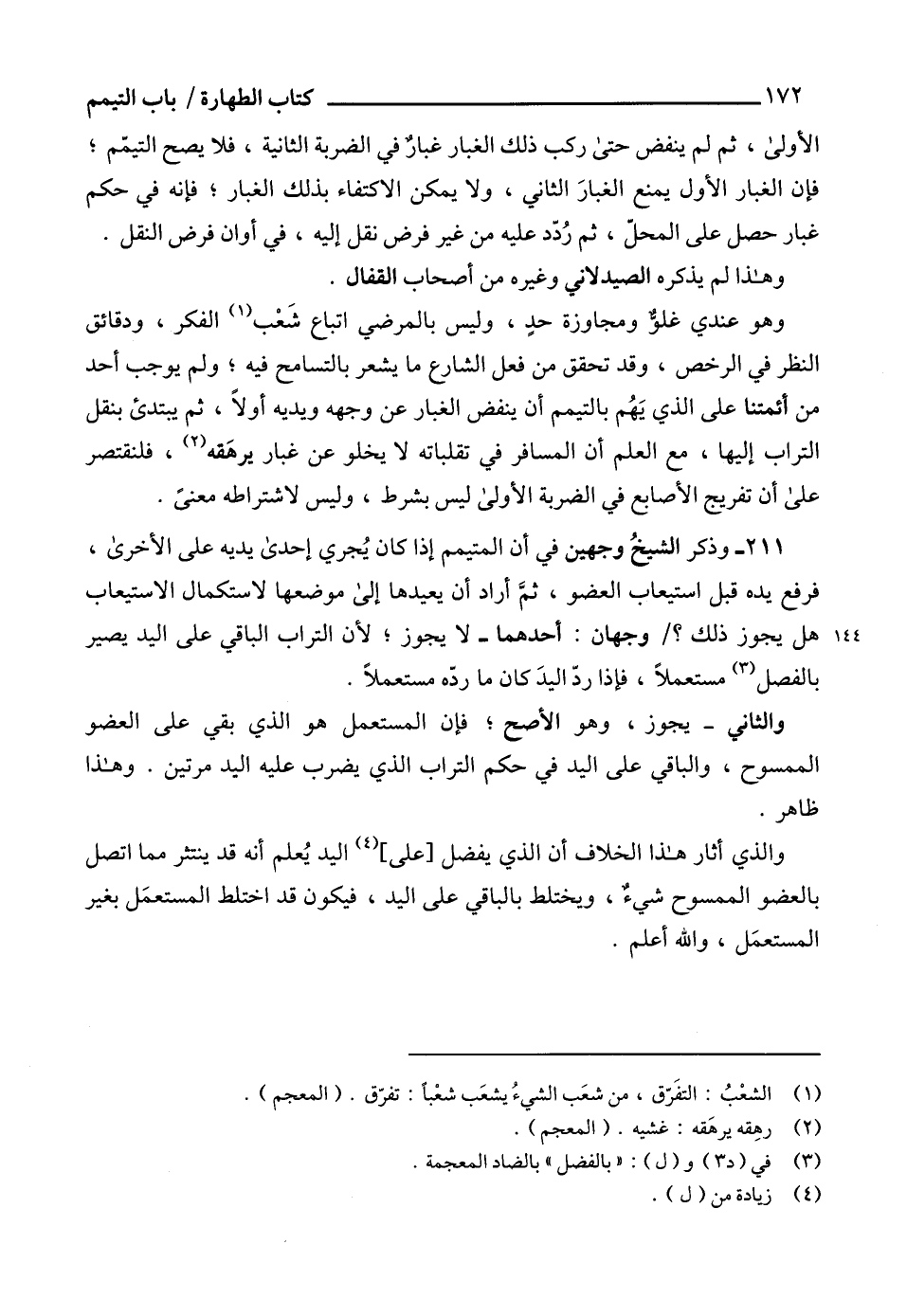 211 - وذكر الشيخُ وجهين في أن المتيمم إذا كان يُجري إحدى يديه على الأخرى، فرفع يده قبل استيعاب العضو، ثمَّ أراد أن يعيدها إلى موضعها لاستكمال الاستيعاب هل يجوز ذلك؟ وجهان: أحدهما - لا يجوز؛ لأن التراب الباقي على اليد يصير بالفصل (¬3) مستعملاً، فإذا ردّ اليدَ كان ما ردّه مستعملاً.