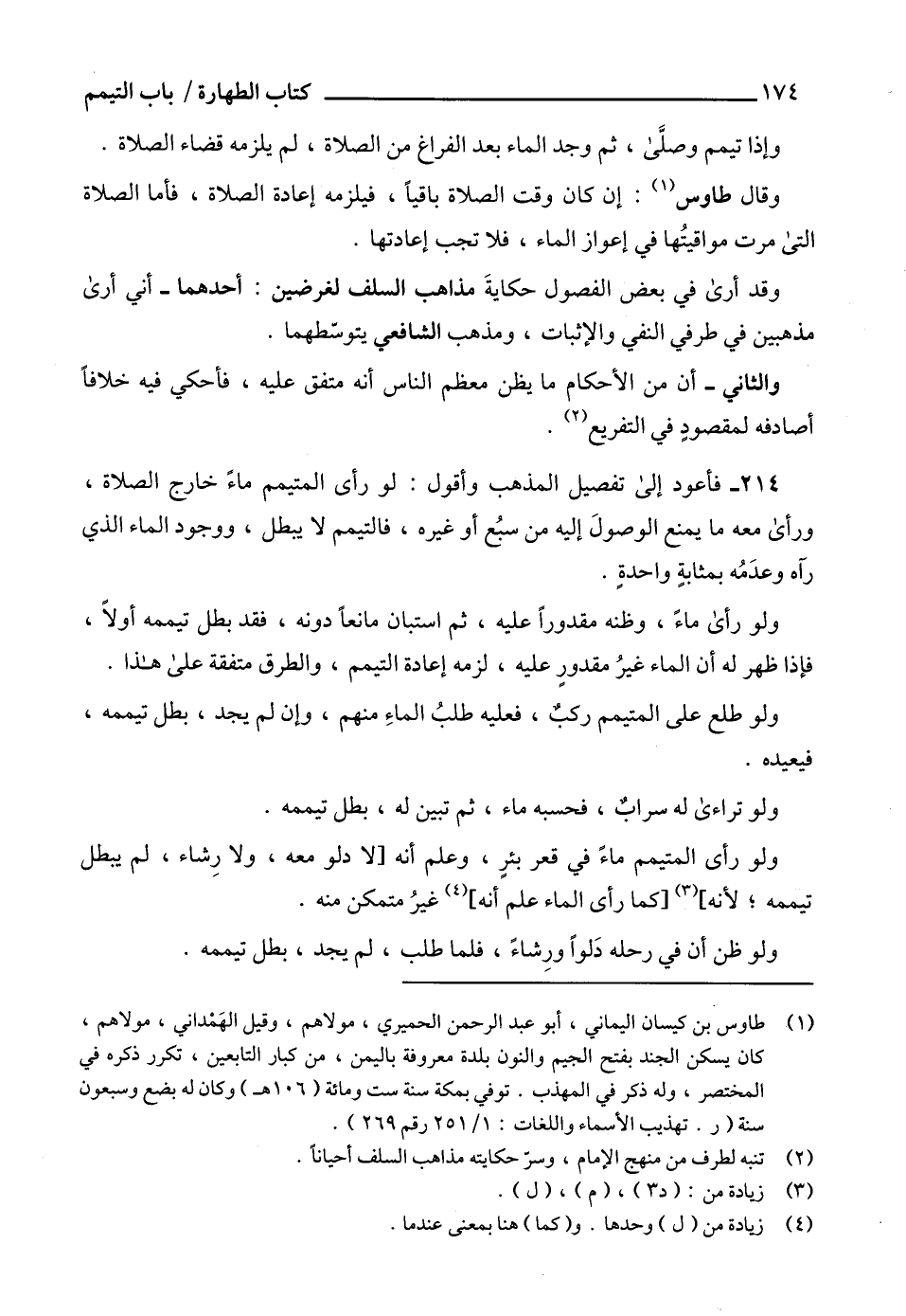 (¬1) طاوس بن كيسان اليماني، أبو عبد الرحمن الحميري، مولاهم، وقيل الهَمْداني، مولاهم، كان يسكن الجند بفتح الجيم والنون بلدة معروفة باليمن، من كبار التابعين، تكرر ذكره في المختصر، وله ذكر في المهذب. توفي بمكة سنة ست ومائة (106 هـ) وكان له بضع وسبعون سنة (ر. تهذيب الأسماء واللغات: 1/ 251 رقم 269).