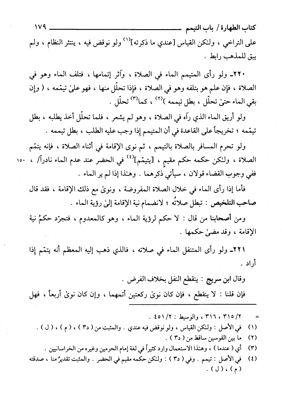 221 - ولو رأى المتنفل الماء في صلاته، فالذي ذهب إليه المعظم أنه يتمّم إِذا أراد.