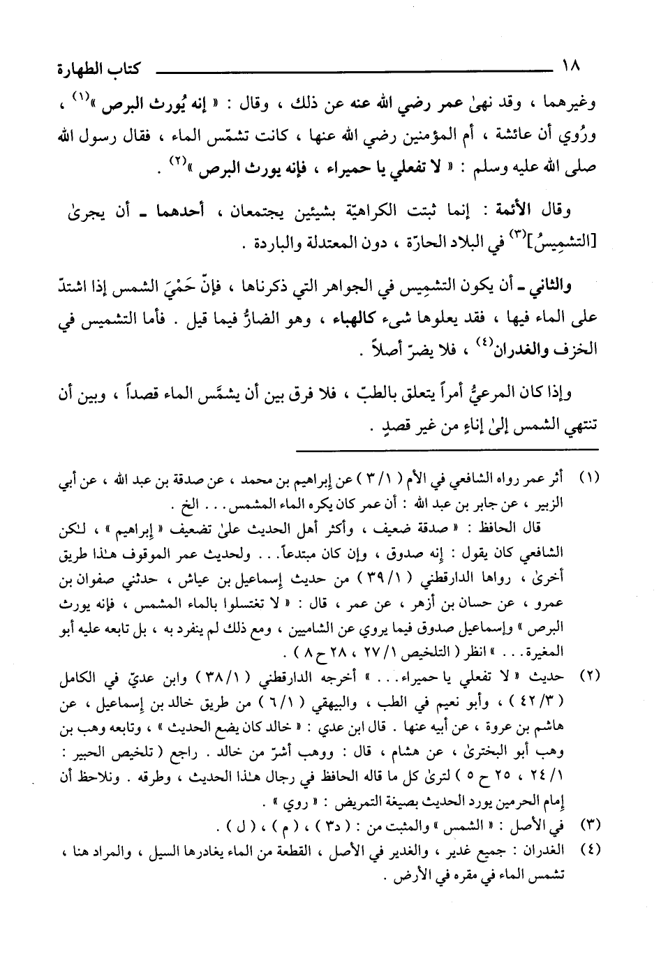 (¬1) أثر عمر رواه الشافعي في الأم (1/ 3) عن إِبراهيم بن محمد، عن صدقة بن عبد الله، عن أبي الزبير، عن جابر بن عبد الله: أن عمر كان يكره الماء المشمس ... الخ.