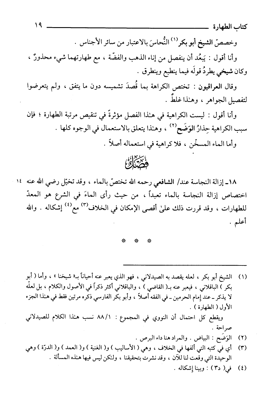 (¬1) الشيخ أبو بكر، لعله يقصد به الصيدلاني، فهو الذي يعبر عنه أحياناً بـ "شيخنا"، وأما (أبو بكر) الباقلاني، فيعبر عنه بـ (القاضي)، والباقلاني أكثر ذكراً في الأصول والكلام، بل لعلّه لا يذكر -عند إِمام الحرمين- في الفقه أصلاً، وأبو بكر الفارسي ذكره مرتين فقط في هذا الجزء الأول (الطهارة).