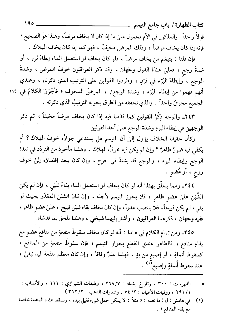 245 - ومن تمام الكلام في هذا: أنه لو كان يخاف سقوطَ منفعةٍ من منافع عضوٍ مع بقاءِ منافع، فالظاهر عندي القطع بجواز التيمم؛ فإن سقوطَ منفعةٍ من المنافع، كسقوط أنملةٍ، أو إصبع من يدٍ، فهذا عذرٌ وفاقاً، وإن كان معظم منفعة اليد تبقى، عند سقوط أُنملةٍ وإصبع (¬1).