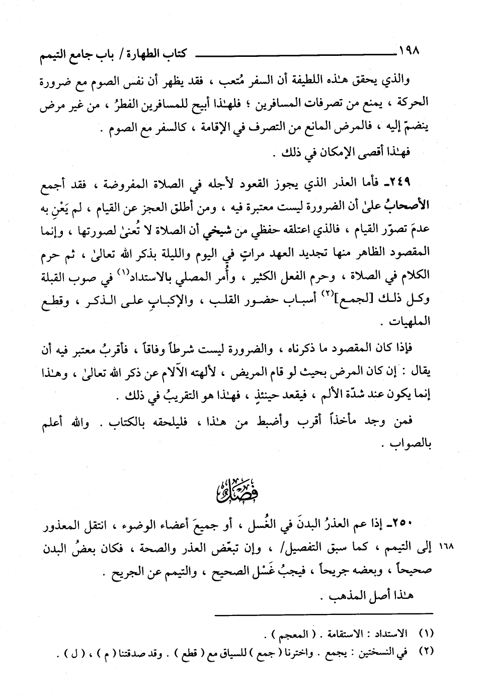 250 - إذا عم العذرُ البدنَ في الغُسل، أو جميعَ أعضاء الوضوء، انتقل المعذور إلى التيمم، كما سبق التفصيل، وإن تبغض العذر والصحة، فكان بعضُ البدن صحيحاً، وبعضه جريحاً، فيجبُ غَسْل الصحيح، والتيمم عن الجريح.