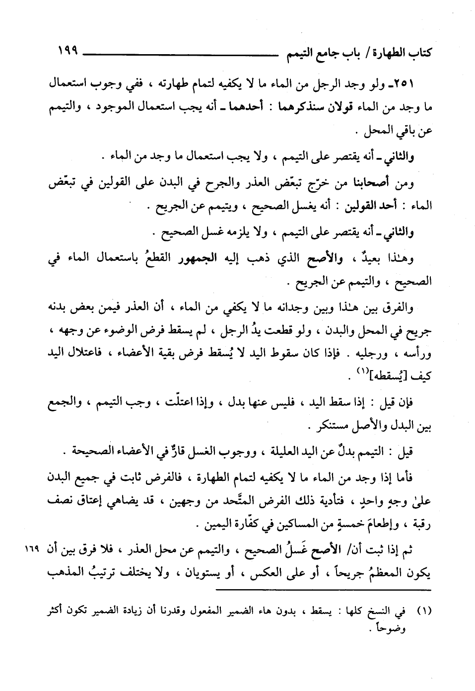 251 - ولو وجد الرجل من الماء ما لا يكفيه لتمام طهارته، ففي وجوب استعمال ما وجد من الماء قولان سنذكرهما: أحدهما - أنه يجب استعمال الموجود، والتيمم عن باقي المحل.