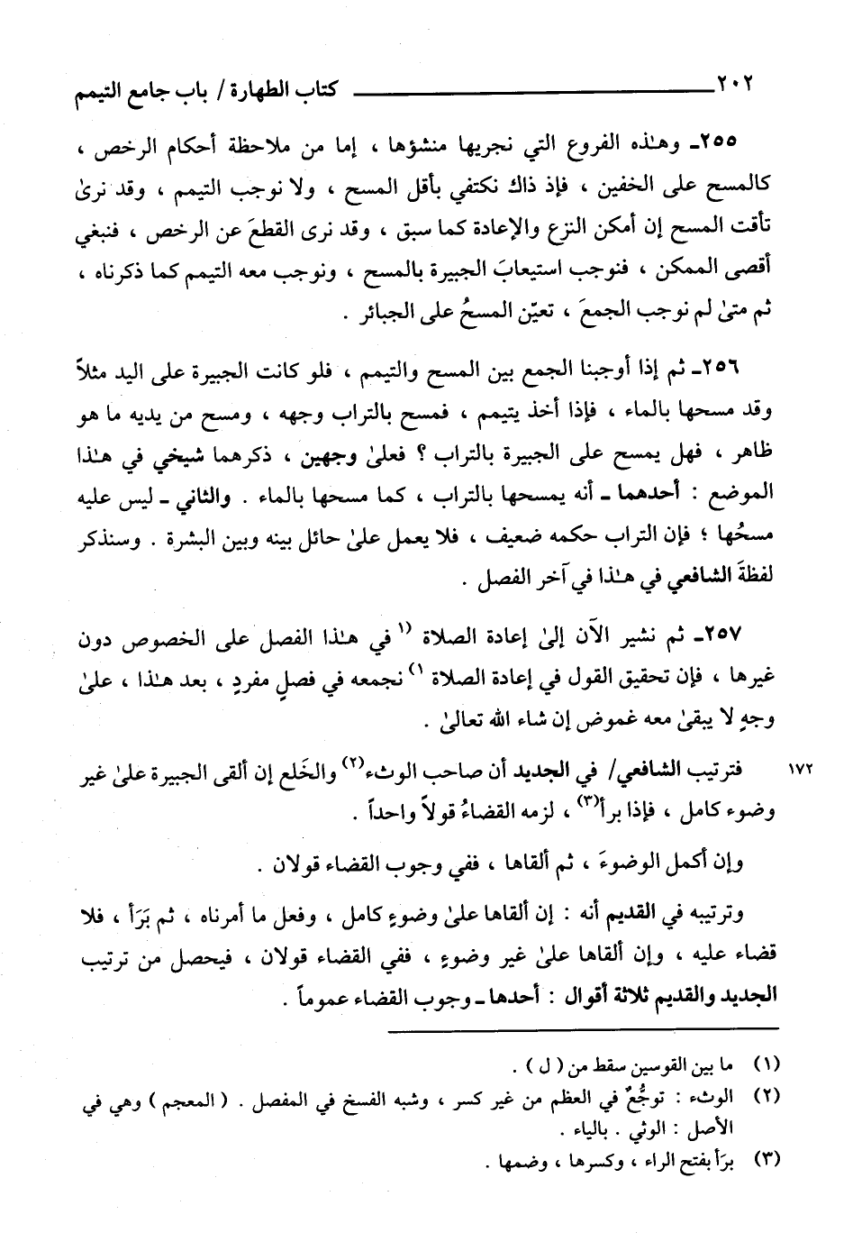 255 - وهذه الفروع التي نجريها منشؤها، إما من ملاحظة أحكام الرخص، كالمسح على الخفين، فإذ ذاك نكتفي بأقل المسح، ولا نوجب التيمم، وقد نرى تأقت المسح إن أمكن النزع والإعادة كما سبق، وقد نرى القطعَ عن الرخص، فنبغي أقصى الممكن، فنوجب استيعابَ الجبيرة بالمسح، ونوجب معه التيمم كما ذكرناه، ثم متى لم نوجب الجمعَ، تعيّن المسحُ على الجبائر.