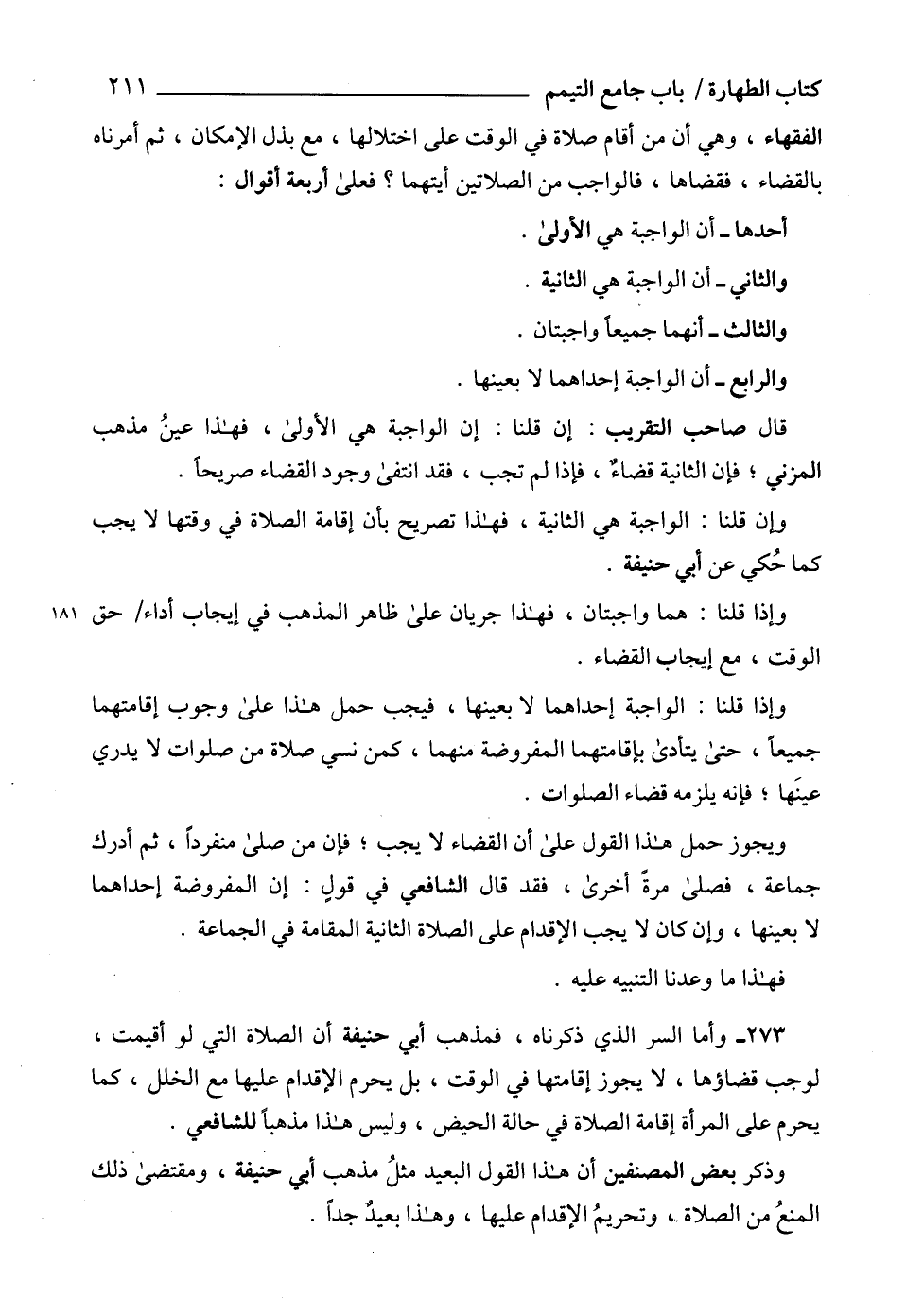 273 - وأما السر الذي ذكرناه، فمذهب أبي حنيفة أن الصلاة التي لو أقيمت، لوجب قضاؤها، لا يجوز إقامتها في الوقت، بل يحرم الإقدام عليها مع الخلل، كما يحرم على المرأة إقامة الصلاة في حالة الحيض، وليس هذا مذهباً للشافعي.