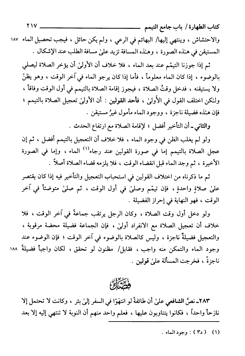 283 - نصَّ الشافعي على أن طائفةً لو انتهَوْا في السفر إلى بئر، وكانت لا تحتمل إلا نازحاً واحداً، فكانوا يتناوبون عليها، فعلم واحد منهم أن النوبة لا تنتهي إليه إلا بعد