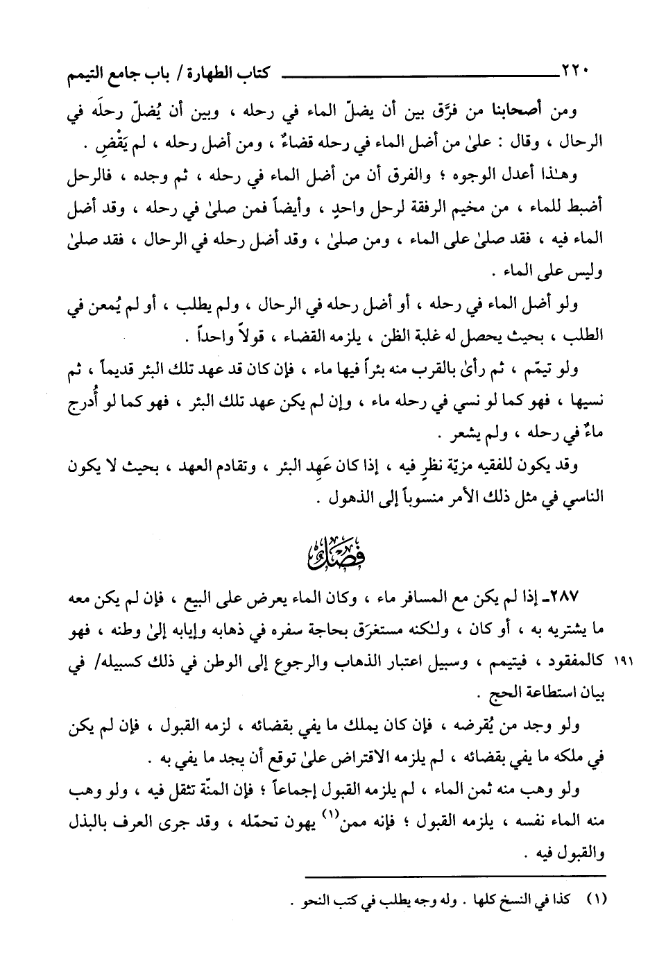 287 - إذا لم يكن مع المسافر ماء، وكان الماء يعرض على البيع، فإن لم يكن معه ما يشتريه به، أو كان، ولكنه مستغرَق بحاجة سفره في ذهابه وإيابه إلى وطنه، فهو كالمفقود، فيتيمم، وسبيل اعتبار الذهاب والرجوع إلى الوطن في ذلك كسبيله في بيان استطاعة الحج.