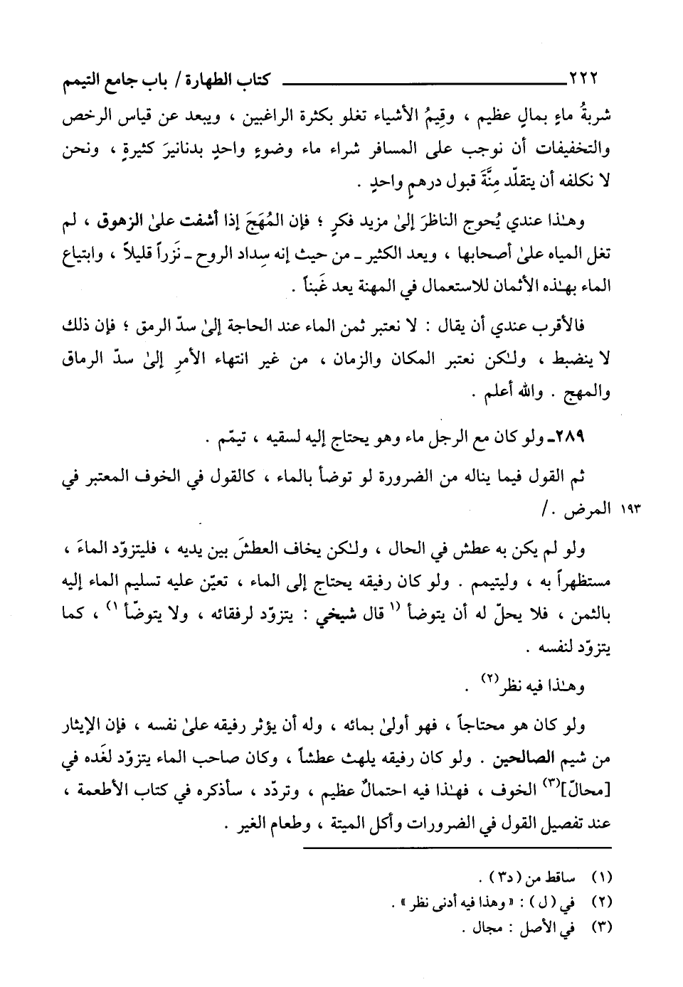 وهذا عندي يُحوج الناظرَ إلى مزيد فكرٍ؛ فإن المُهَجَ إذا أشفت على الزهوق، لم تغل المياه على أصحابها، ويعد الكثير -من حيث إنه سِداد الروح- نَزراً قليلاً، وابتياع الماء بهذه الأثمان للاستعمال في المهنة يعد غَبناً.