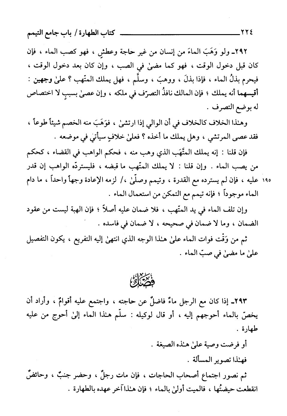 292 - ولو وَهَبَ الماءَ من إنسان من غير حاجة وعطشٍ، فهو كصب الماء، فإن كان قبل دخول الوقت، فهو كما مضى في الصب، وإن كان بعد دخول الوقت، فيحرم بذلُ الماء، فإذا بذلَ، ووهبَ، وسلَّم، فهل يملك المتهب؟ على وجهين: أقيسهما أنه يملك؛ فإن المالك نافذُ التصرّف في ملكه، وإن عصى بسببٍ لا اختصاص له بوضع التصرف.