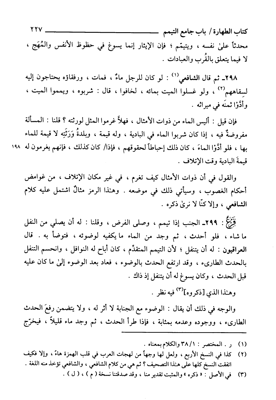 298 - ثم قال الشافعي (¬1): لو كان للرجل ماءٌ، فمات، ورفقاؤه يحتاجون إليه لسِقاههم (¬2)، ولو غسلوا الميت بمائه، لخافوا، قال: شربوه، ويمموا الميت، وأدَّوْا ثمنَه في ميراثه.
