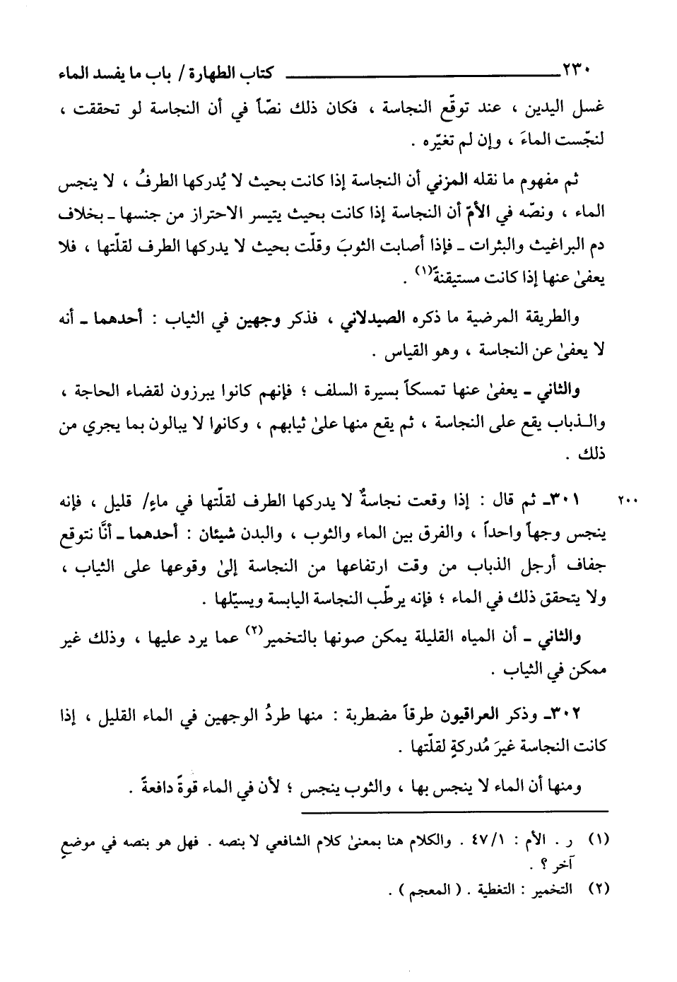 301 - ثم قال: إذا وقعت نجاسةٌ لا يدركها الطرف لقلّتها في ماءٍ قليل، فإنه ينجس وجهاً واحداً، والفرق بين الماء والثوب، والبدن شيئان: أحدهما - أنَّا نتوقع جفاف أرجل الذباب من وقت ارتفاعها من النجاسة إلى وقوعها على الثياب، ولا يتحقق ذلك في الماء؛ فإنه يرطب النجاسة اليابسة ويسيّلها.