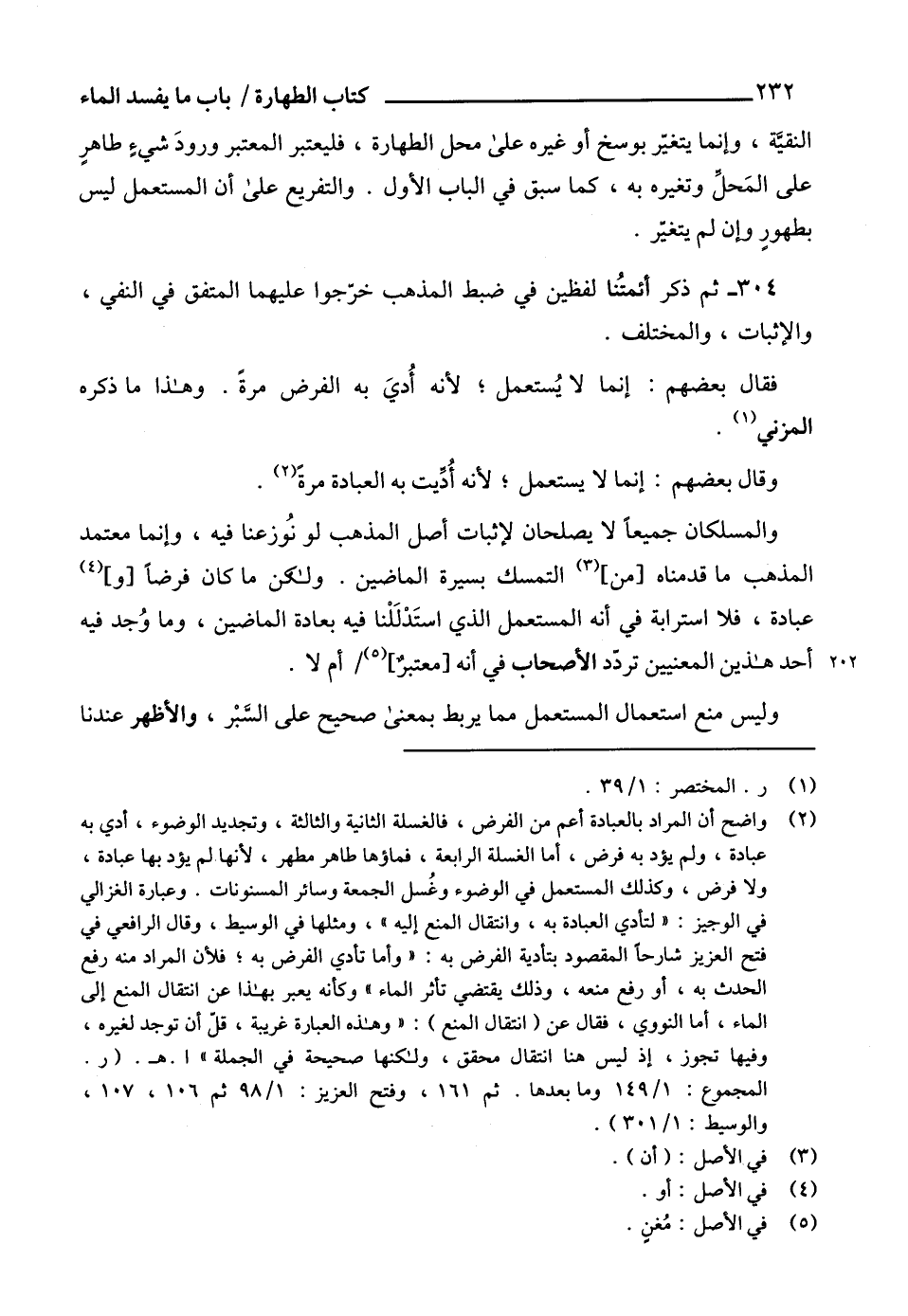 (¬2) واضح أن المراد بالعبادة أعم من الفرض، فالغسلة الثانية والثالثة، وتجديد الوضوء، أدي به عبادة، ولم يؤد به فرض، أما الغسلة الرابعة، فماؤها طاهر مطهر، لأنها لم يؤد بها عبادة، ولا فرض، وكذلك المستعمل في الوضوء وغُسل الجمعة وسائر المسنونات. وعبارة الغزالي في الوجيز: "لتأدي العبادة به، وانتقال المنع إليه"، ومثلها في الوسيط، وقال الرافعي في فتح العزيز شارحاً المقصود بتأدية الفرض به: " وأما تأدي الفرض به؛ فلأن المراد منه رفع الحدث به، أو رفع منعه، وذلك يقتضي تأثر الماء " وكأنه يعبر بهذا عن انتقال المنع إلى الماء، أما النووي، فقال عن (انتقال المنع): "وهذه العبارة غريبة، قلّ أن توجد لغيره، وفيها تجوز، إذ ليس هنا انتقال محقق، ولكنها صحيحة في الجملة" ا. هـ. (ر. المجموع: 1/ 149 وما بعدها. ثم 161، وفتح العزيز: 1/ 98 ثم 106، 107، والوسيط: 1/ 301).
