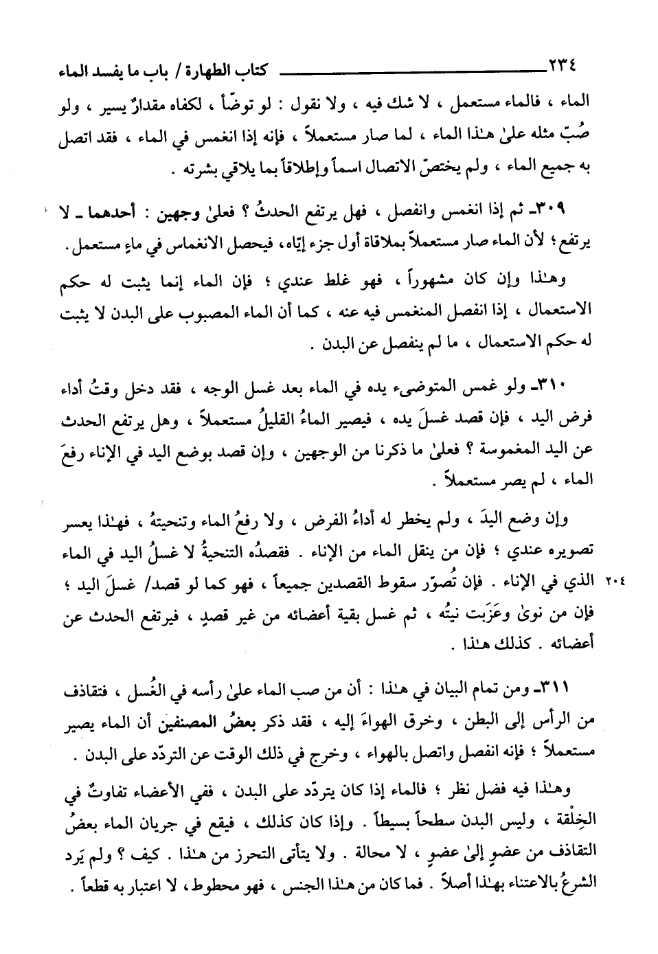 311 - ومن تمام البيان في هذا: أن من صب الماء على رأسه في الغُسل، فتقاذف من الرأس إلى البطن، وخرق الهواءَ إليه، فقد ذكر بعضُ المصنفين أن الماء يصير مستعملاً؛ فإنه انفصل واتصل بالهواء، وخرج في ذلك الوقت عن التردّد على البدن.