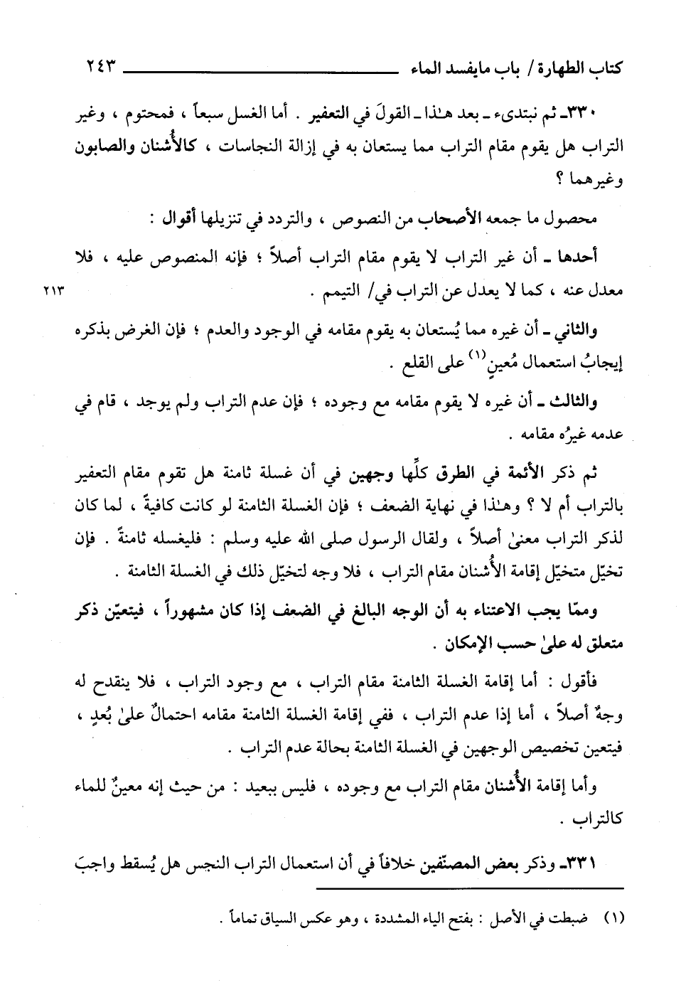 330 - ثم نبتدىء -بعد هذا- القولَ في التعفير. أما الغسل سبعاً، فمحتوم، وغير التراب هل يقوم مقام التراب مما يستعان به في إزالة النجاسات، كالأُشنان والصابون وغيرهما؟