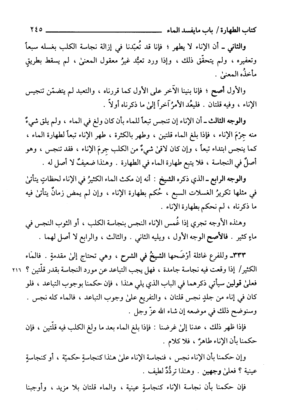 333 - وللفرع غائلة أوْضَحها الشيخُ في الشرح، وهي تحتاج إلى مقدمةٍ. فالماء الكثير إذا وقعت فيه نجاسة جامدة، فهل يجب التباعد عن مورد النجاسة بقدر قلّتين؟