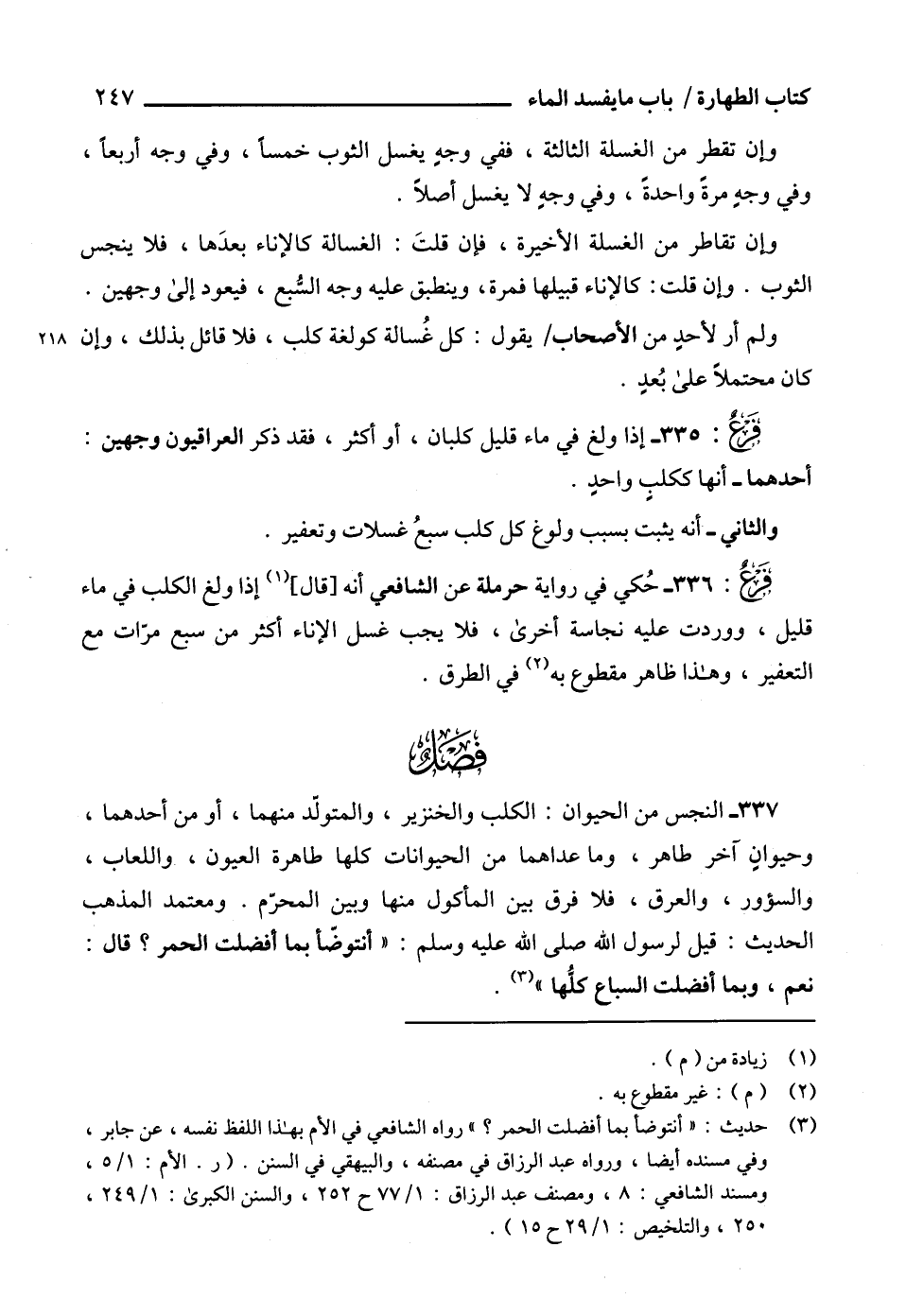 336 - حُكي في رواية حرملة عن الشافعي أنه [قال] (¬1) إذا ولغ الكلب في ماء قليل، ووردت عليه نجاسة أخرى، فلا يجب غسل الإناء أكثر من سبع مرّات مع التعفير، وهذا ظاهر مقطوع به (¬2) في الطرق.