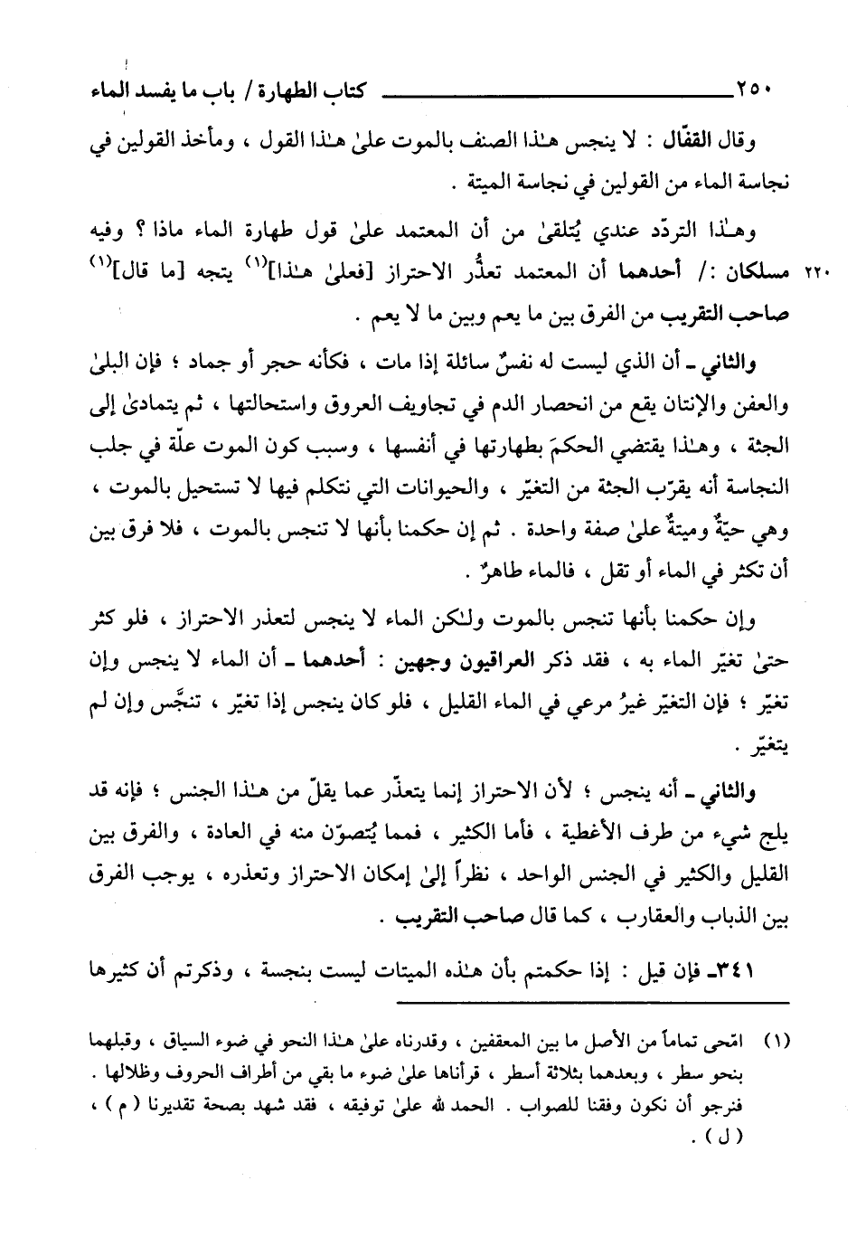 والثاني - أن الذي ليست له نفسٌ سائلة إذا مات، فكأنه حجر أو جماد؛ فإن البلى والعفن والإنتان يقع من انحصار الدم في تجاويف العروق واستحالتها، ثم يتمادى إلى الجثة، وهذا يقتضي الحكمَ بطهارتها في أنفسها، وسبب كون الموت علّة في جلب النجاسة أنه يقرّب الجثة من التغيّر، والحيوانات التي نتكلم فيها لا تستحيل بالموت، وهي حيّةٌ وميتةٌ على صفة واحدة. ثم إن حكمنا بأنها لا تنجس بالموت، فلا فرق بين أن تكثر في الماء أو تقل، فالماء طاهرٌ.