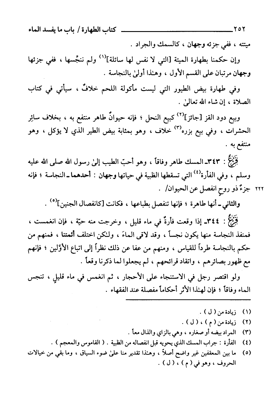 343 - المسك طاهر وفاقاً، وهو أحبّ الطيب إلى رسول الله صلى الله عليه وسلم، وفي الفأرة (¬4) التي تسقطها الظبية في حياتها وجهان: أحدهما - النجاسة؛ فإنه جزءٌ ذو روحٍ انفصل عن الحيوان.