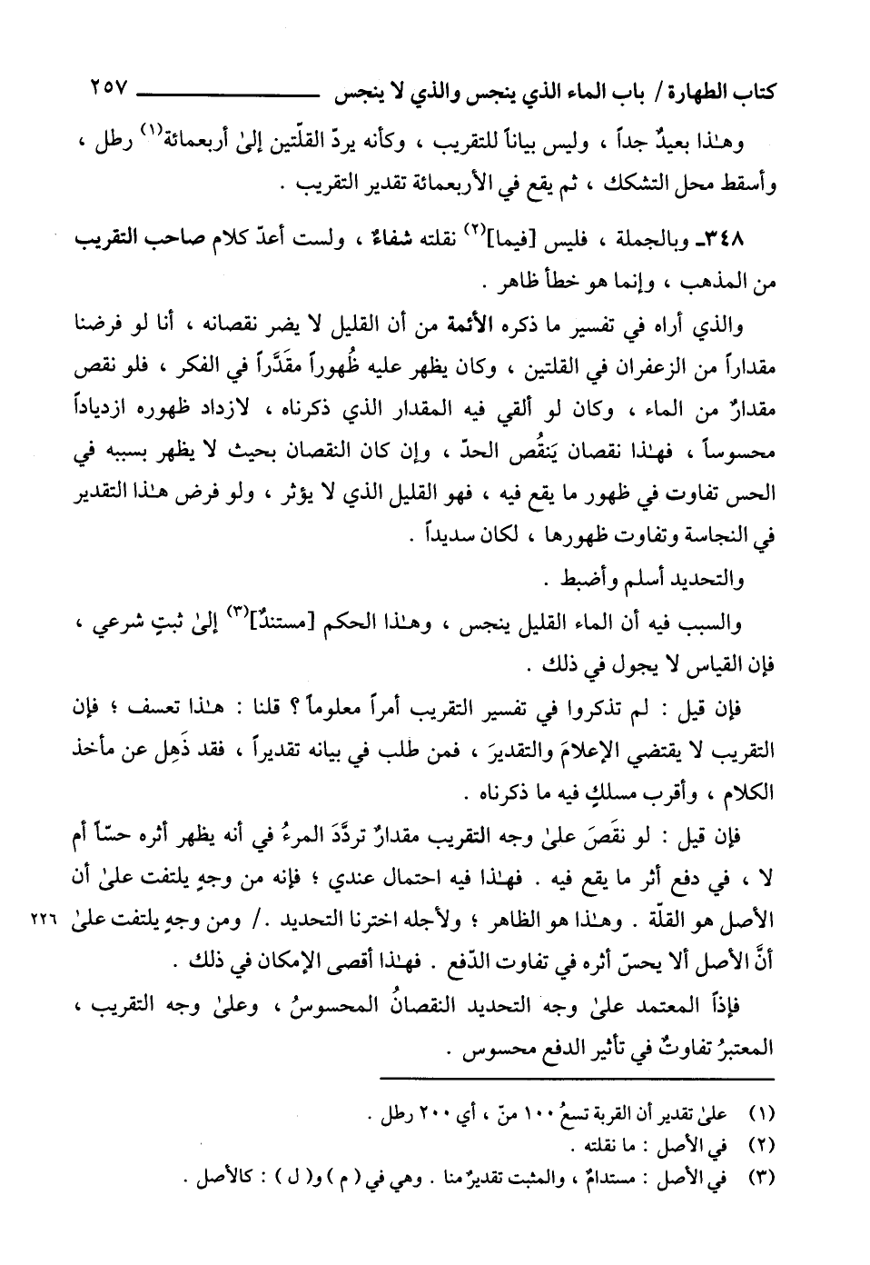 وهذا بعيدٌ جداًً، وليس بياناً للتقريب، وكأنه يردّ القلّتين إلى أربعمائة (¬1) رطل، وأسقط محل التشكك، ثم يقع في الأربعمائة تقدير التقريب.