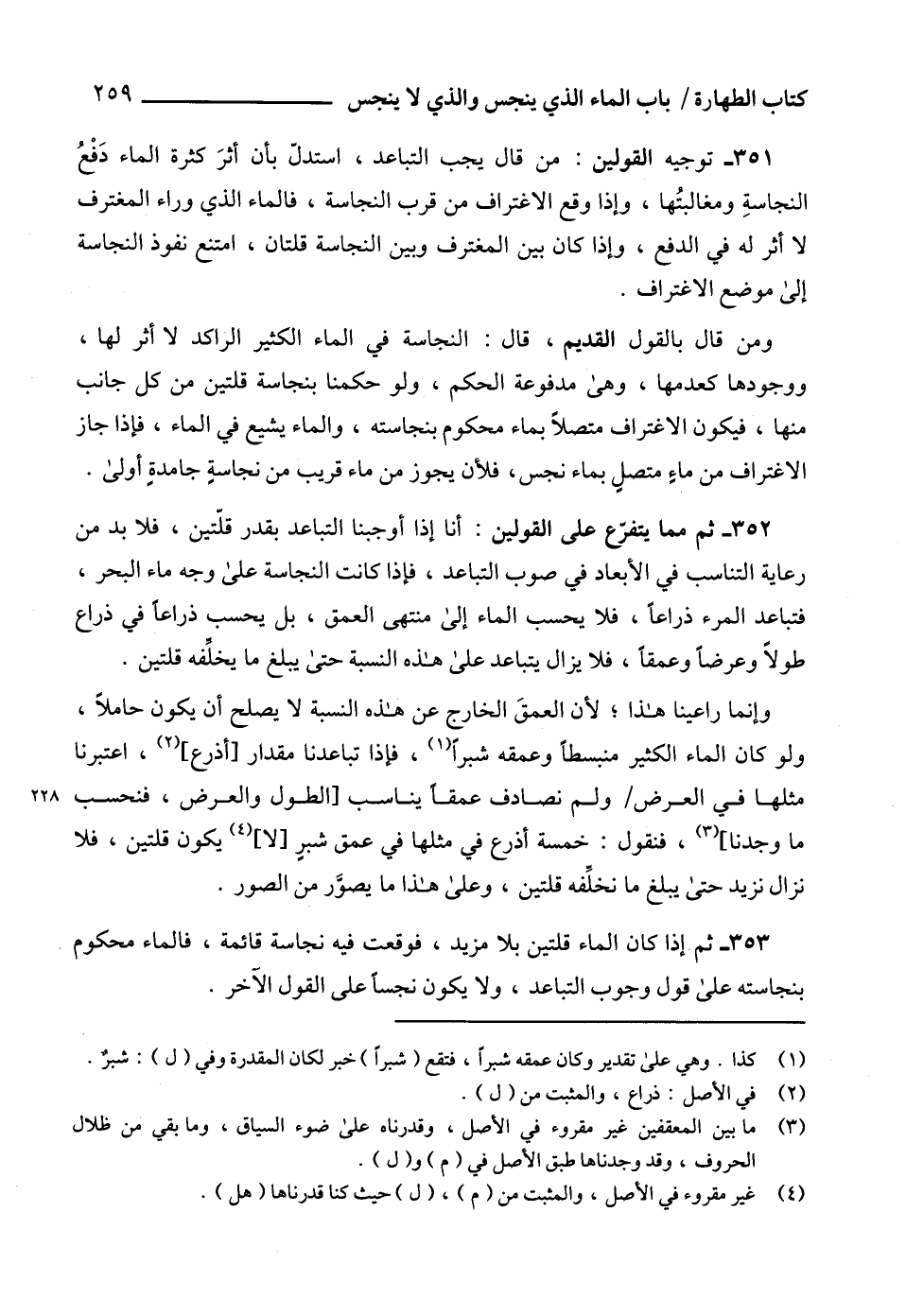 352 - ثم مما يتفرّع على القولين: أنا إذا أوجبنا التباعد بقدر قلّتين، فلا بد من رعاية التناسب في الأبعاد في صوب التباعد، فإذا كانت النجاسة على وجه ماء البحر، فتباعد المرء ذراعاً، فلا يحسب الماء إلى منتهى العمق، بل يحسب ذراعاً في ذراع طولاً وعرضاً وعمقاً، فلا يزال يتباعد على هذه النسبة حتى يبلغ ما يخلِّفه قلتين.
