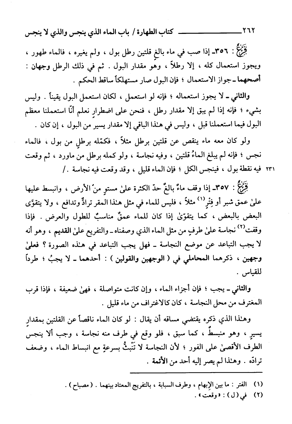 356 - إذا صب في ماء بالغٍ قلتين رطل بول، ولم يغيره، فالماء طهور، ويجوز استعمال كله، إلا رطلاً، وهو مقدار البول. ثم في ذلك الرطل وجهان: أصحهما - جواز الاستعمال؛ فإن البول صار مستهلكاً ساقط الحكم.