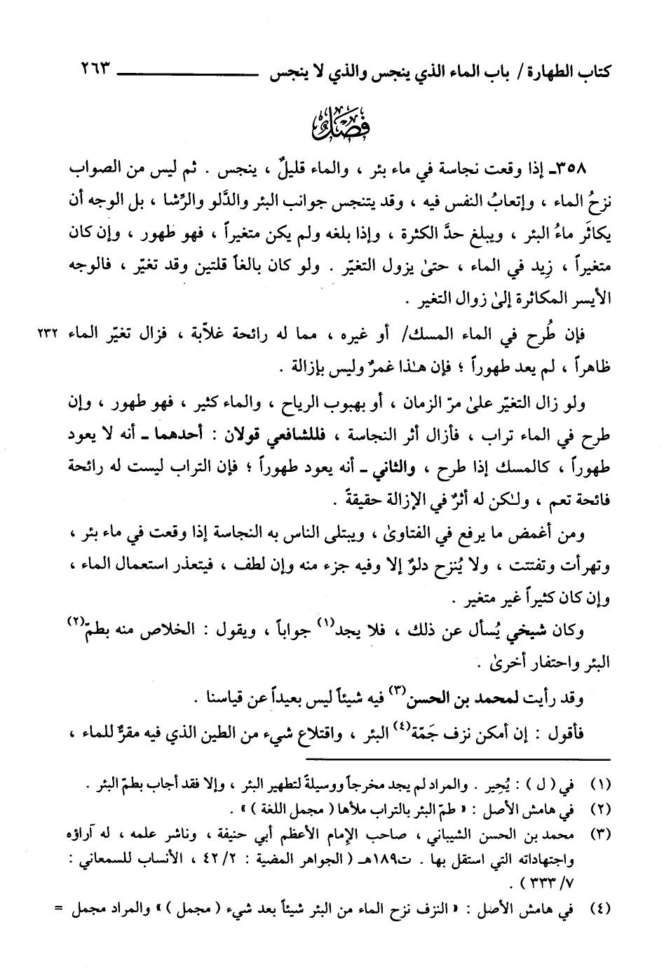 358 - إذا وقعت نجاسة في ماء بئر، والماء قليل، ينجس. ثم ليس من الصواب نزحُ الماء، وإتعابُ النفس فيه، وقد يتنجس جوانب البئر والدَّلو والرِّشا، بل الوجه أن يكاثَر ماءُ البئر، ويبلغ حدَّ الكثرة، وإذا بلغه ولم يكن متغيراً، فهو طهور، وإن كان متغيراً، زِيد في الماء، حتى يزول التغيّر. ولو كان بالغاً قلتين وقد تغيّر، فالوجه الأيسر المكاثرة إلى زوال التغير.