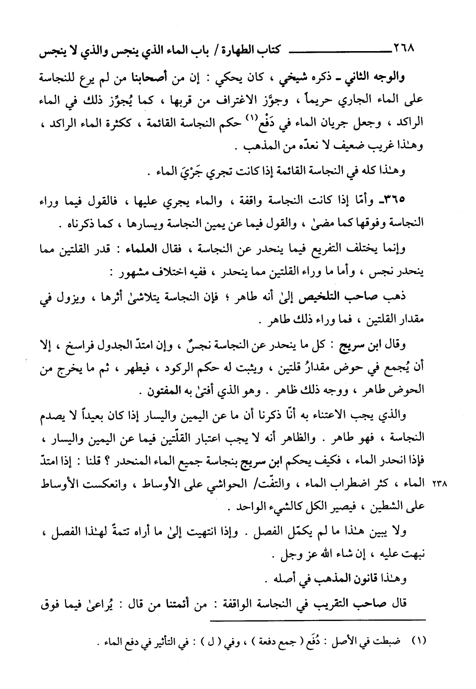 365 - وأمّا إذا كانت النجاسة واقفة، والماء يجري عليها، فالقول فيما وراء النجاسة وفوقها كما مضى، والقول فيما عن يمين النجاسة ويسارها، كما ذكرناه.