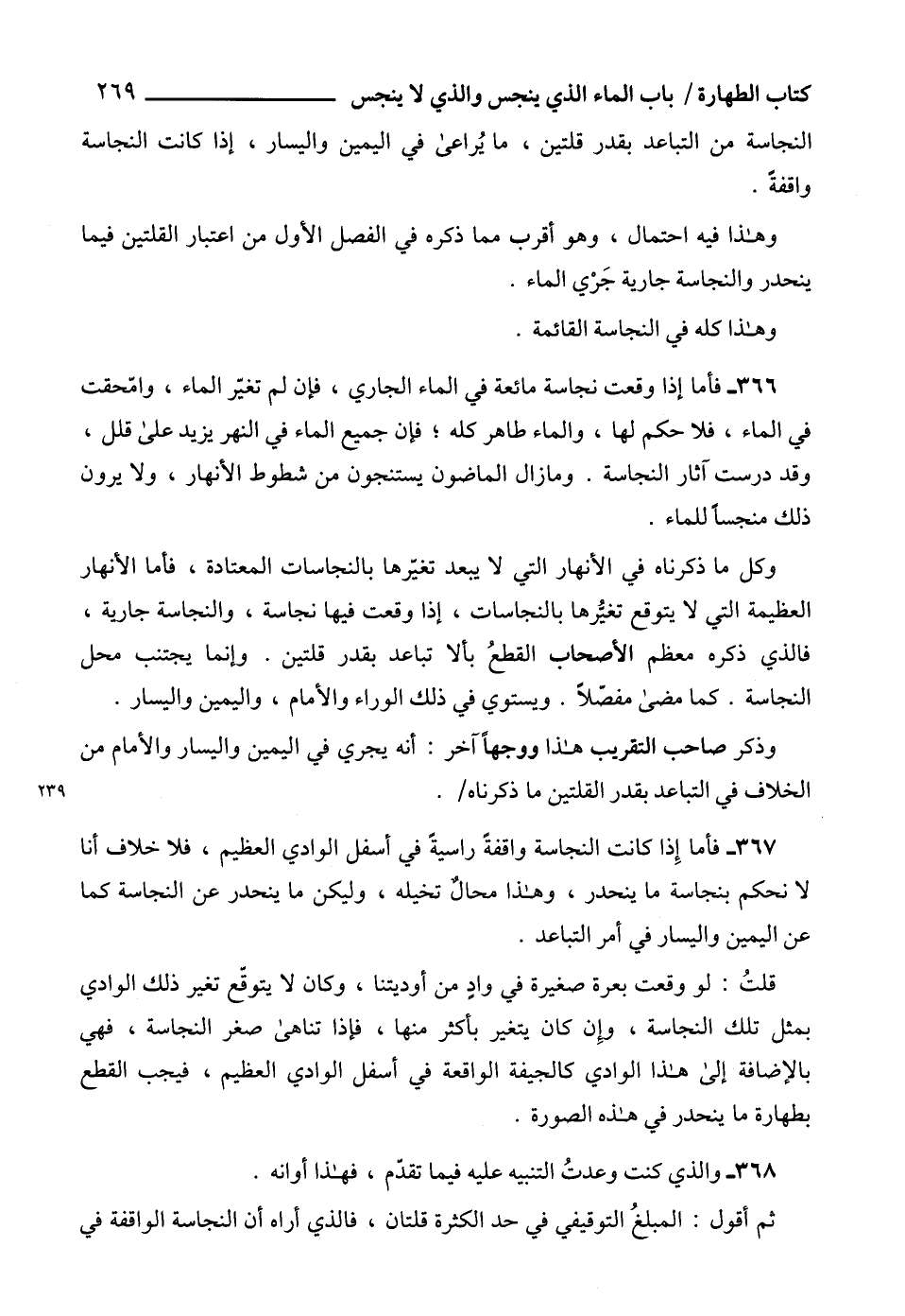 366 - فأما إذا وقعت نجاسة مائعة في الماء الجاري، فإن لم تغيّر الماء، وامّحقت في الماء، فلا حكم لها، والماء طاهر كله؛ فإن جميع الماء في النهر يزيد على قلل، وقد درست آثار النجاسة. وما زال الماضون يستنجون من شطوط الأنهار، ولا يرون ذلك منجساً للماء.