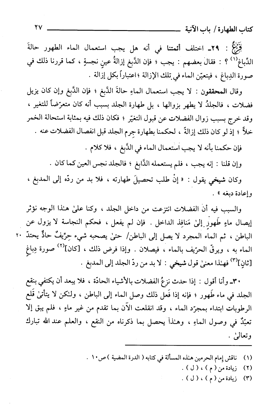 30 - وأنا أقول: إذا حدث نزعُ الفضلات بالأشياء الحادّة، فلا يبعد أن يكتفي بنقع الجلد في ماء طَهور؛ فإنه إذا فَعل ذلك وصل الماء إلى الباطن، ولكن لا يتأتى قَلع الرطوبات ابتداء بمجرّد الماء، ود انقلعت الآن بما تقدم من غير ماءٍ، فلم يبق إلا تعبّدٌ في وصول الماءِ، وهذا يحصل بما ذكرناه من النقع، والعلم عند الله تبارك وتعالى.